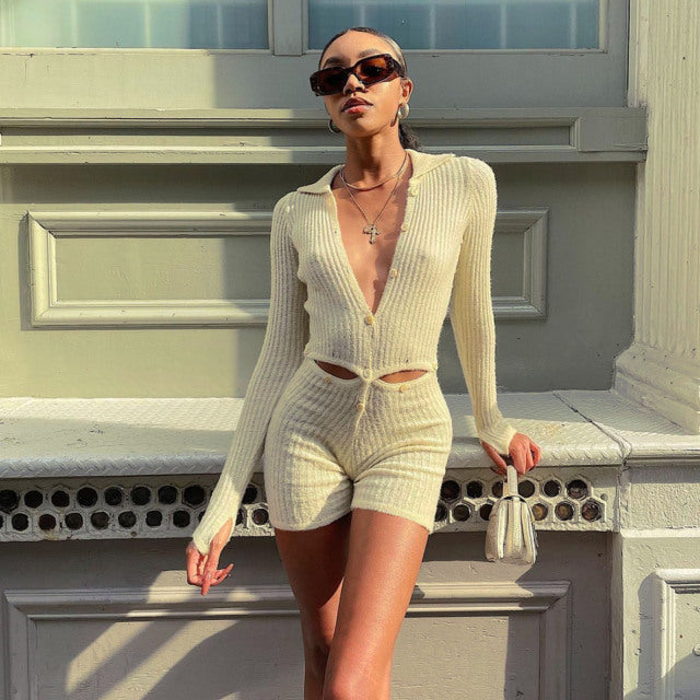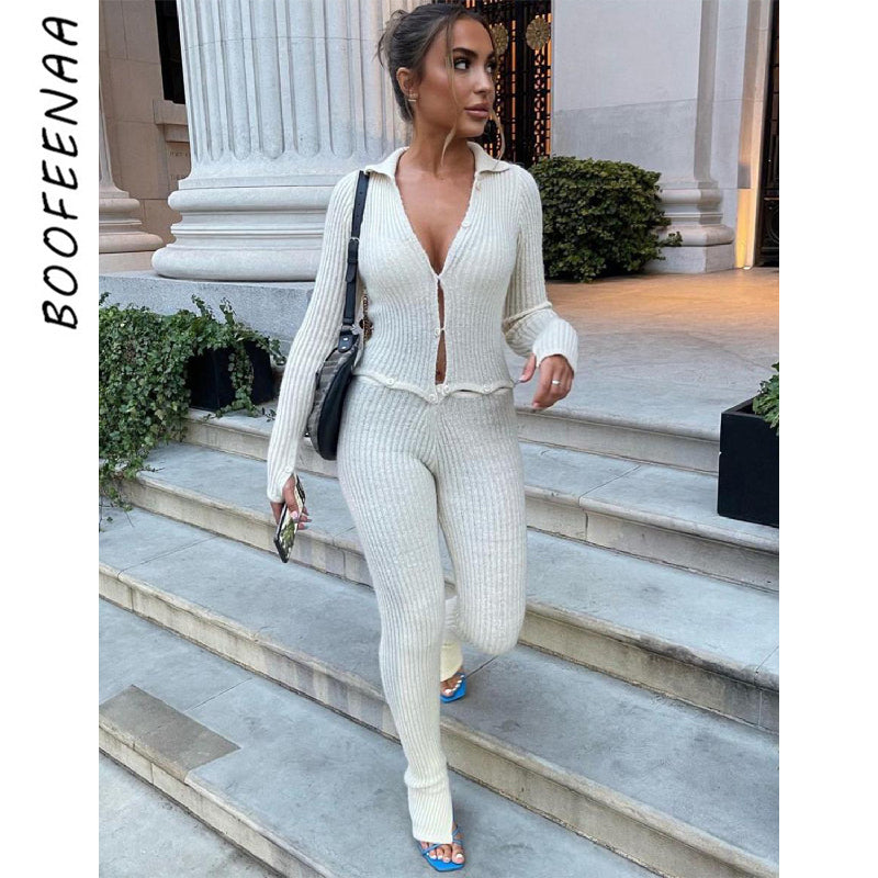 BOOFEENAA Button Ribbed Knitted Jumpsuit Two Piece Set Fall Winter Clothes Sexy White Long Sleeve Bodycon Jumpsuits C88-GE43