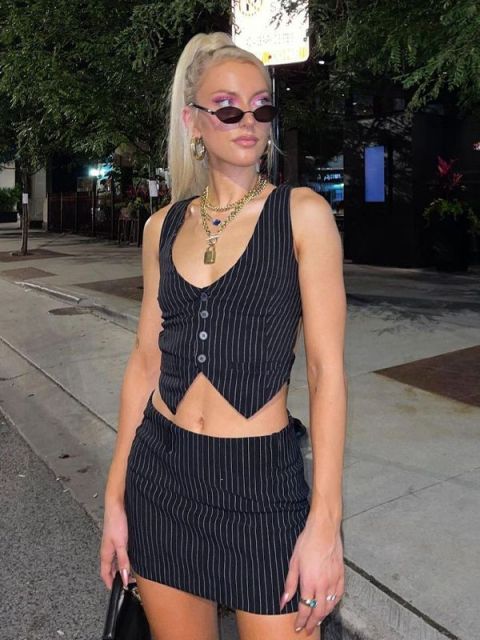 Dulzura Stripe Print Women 2 Pieces Irregular V Neck Vest Mini Skirt Set Streetwear Fashion Crop Top 2021 Autumn Winter Clothes