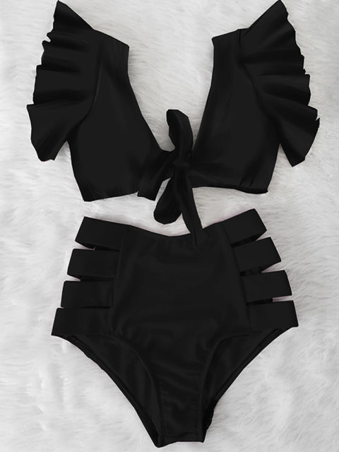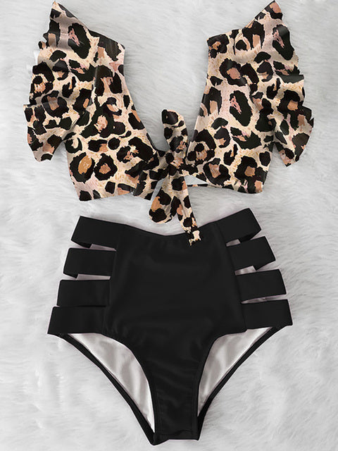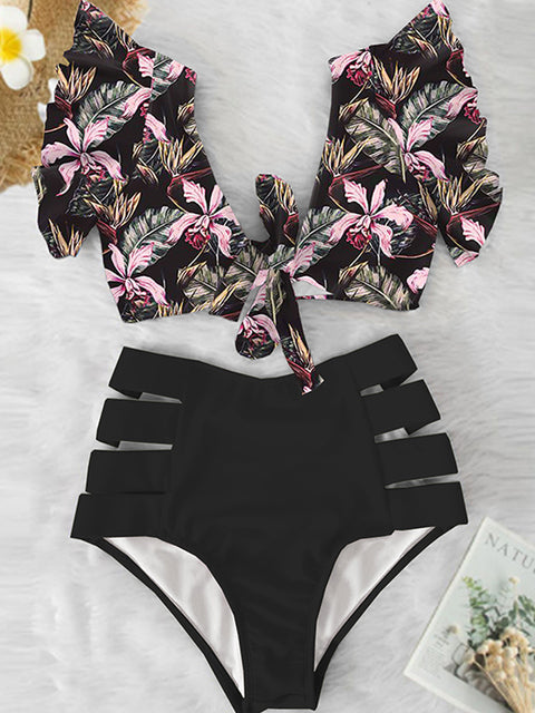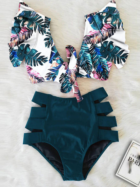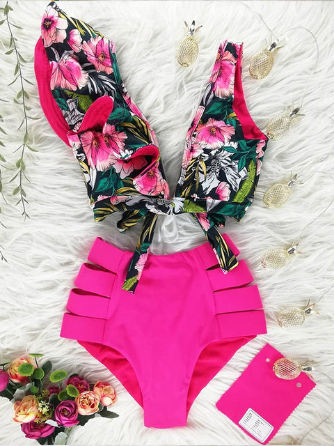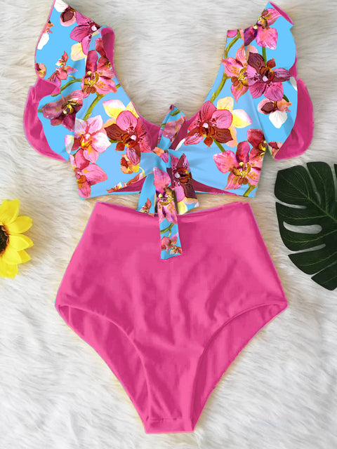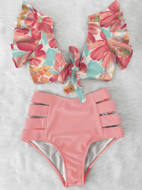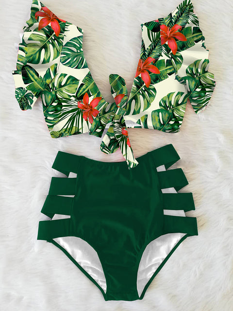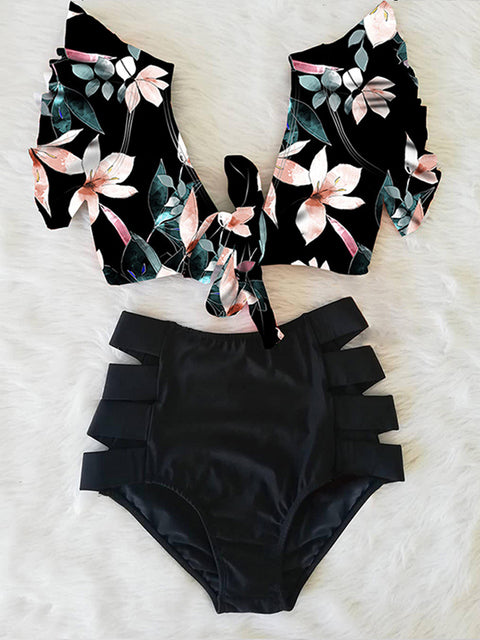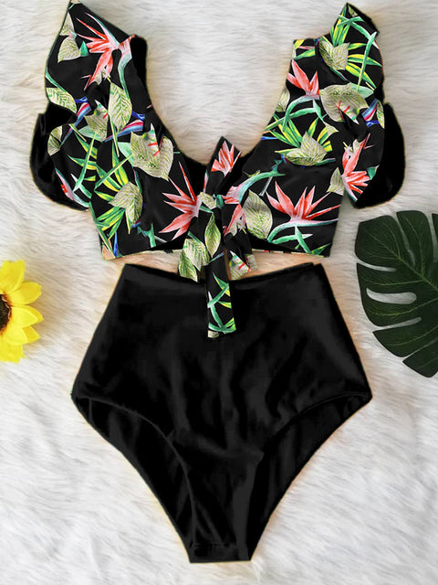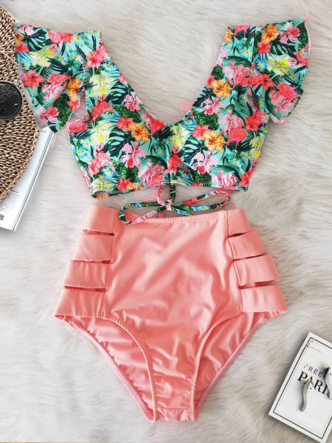 Floral Ruffled Hem Bikini Set Women Flora V-Neck High-Waisted Two Piece Swimsuit 2022 Girl Beach Bathing Suit Swimwear Biquinis