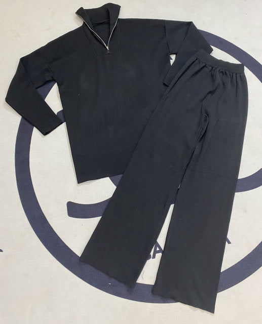 Free Shipping Casual Autumn Loose Knit Sweater Set Fashion Zip Lapel Long Sleeve Pullover Sweater & Straight Pants Two-piece Set