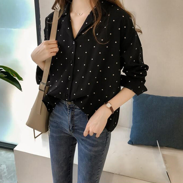 Pocket Long Sleeve Turn Down Collar Women Blouse Office Lady Polka Dot Cotton Casual Shirts 2021 New Spring