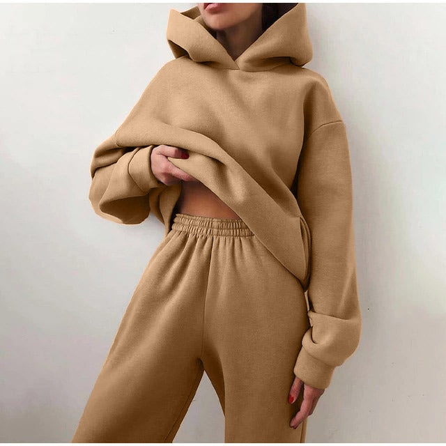 Women Solid Fleece Tracksuit And Hooded Jogger Pants Two Piece Set 2021 Autumn Winter Female Oversized Casual Sportswear Suit